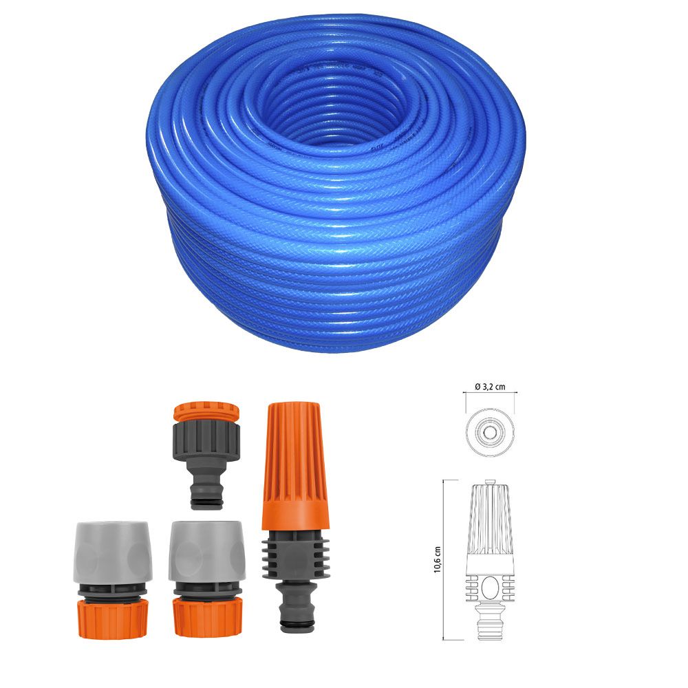 - Produzida em plástico, o kit conta com engates rápidos e esguicho de fácil manuseio, com prático sistema de regulagem do fluxo d'água através do regulador frontal. Já a Mangueira de Jardim é fabricada em duas camadas de PVC flexível, assim proporcionando excelente flexibilidade e resistência à média pressão (Obs: para aumentar a durabilidade da mangueira, não a deixar exposta ao sol após o uso). Ambos produtos são fabricados com matéria-prima de alta qualidade proporcionando uma irrigação precisa e confiável.